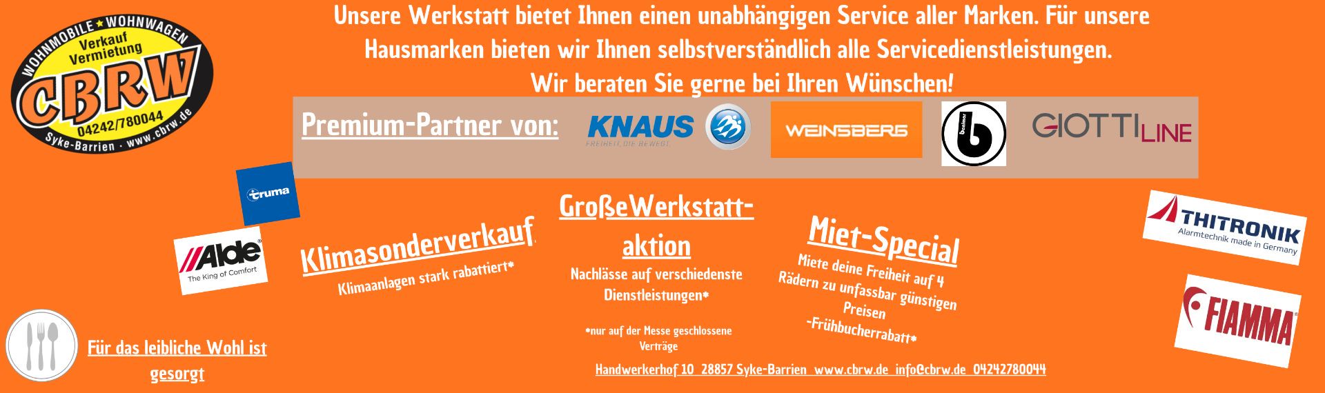 Unser Werkstattbetrieb ist markenfrei, jedes Fabrikat ist willkommen. Serviceverträge bestehen für die Marken: Carthago, Malibu, Benimar, Panama, Knaus, Weinsberg, Hobby und Miniatouring